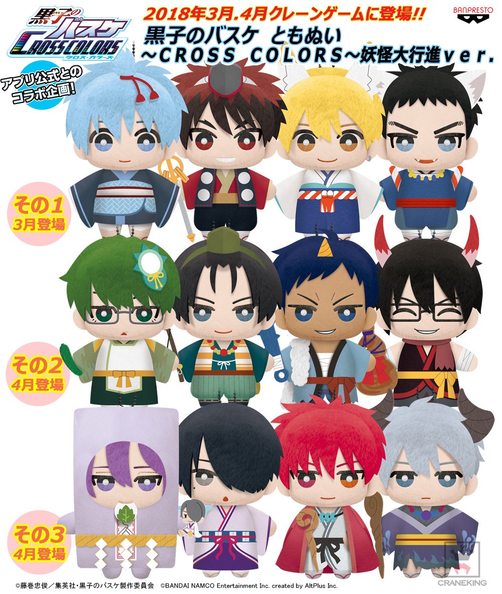 【バンプレスト】2018年3月予定、アプリゲーム「黒子のバスケ CROSS COLORS」の「妖怪大行進」のアバターデザインがぬいぐるみになって全国のゲームセンターに登場です!その3までの全12種で続々登場予定です tv.kurobas.com/news/2017/10/e… #kurobas