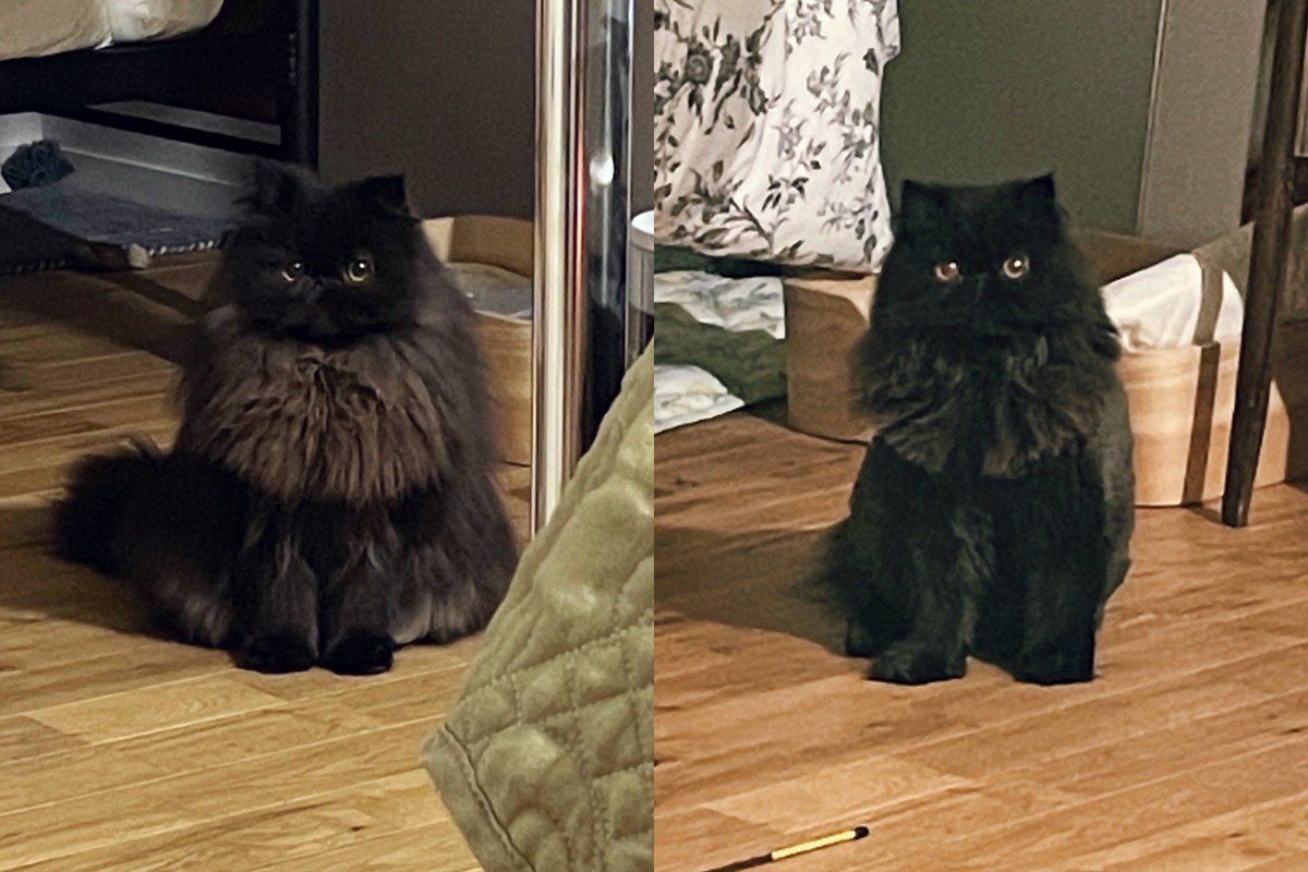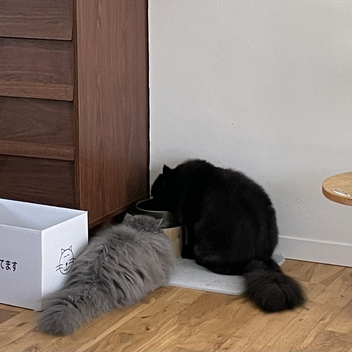 オッドアイの白猫てふ🌈、ロン毛の黒猫こち、グレーの保護猫モネ