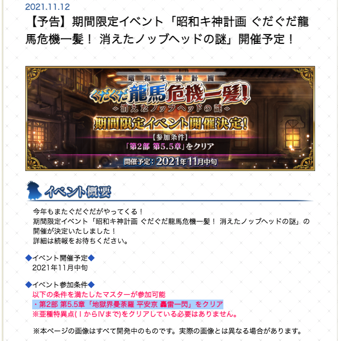ここ数年はコラボ記念生放送→直コラボイベントスタートの流れが続いているので、明日のメンテでイベントの準備が行われている可能性は正直たかそう。