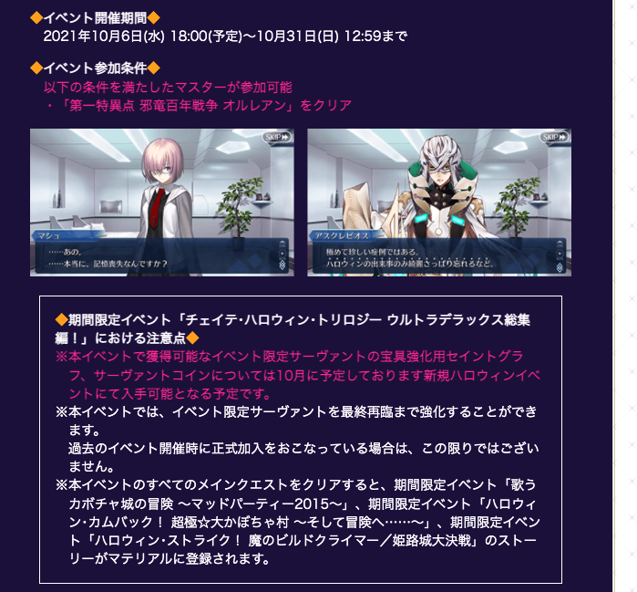 「過去のハロウィンを振り返ることで、マスターは失った記憶を取り戻そうと試みるのだが……?」