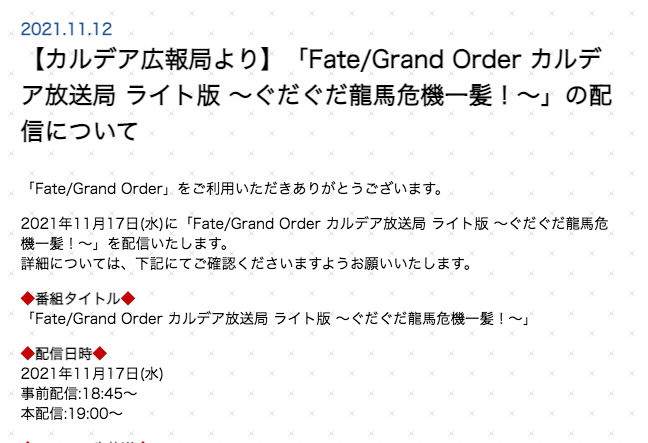 ・11月の新イベは「ぐだぐだ龍馬危機一髪!」