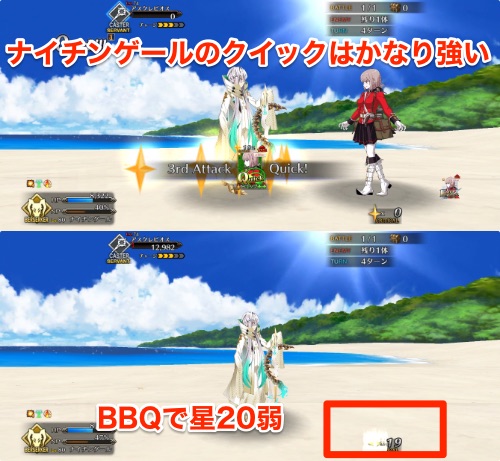 豆知識?ですがナイチンゲールのクイックは超高性能なので、BBQで星を20弱出せます。その後にお祈りクリティカル運ゲーするのが良さそうです。
