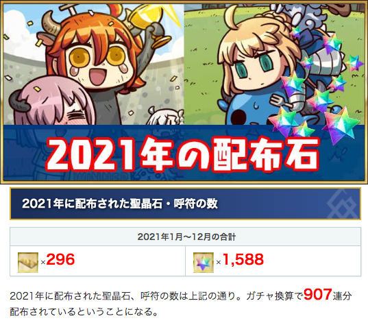 2021年の合計配布石を集計してみました。なんと、1年でガチャ907連分が配布されています!