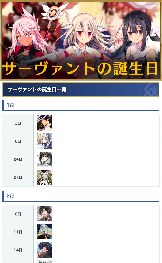 【サーヴァントの誕生日一覧】※攻略班調べ