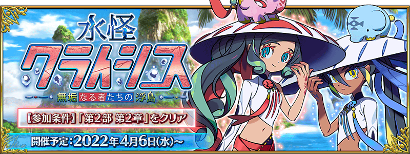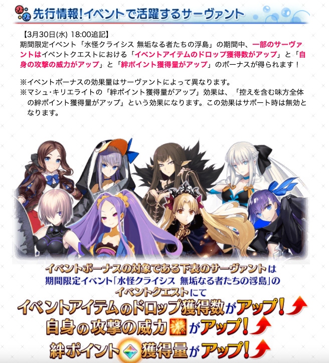 「水怪クライシス 無垢なる者たちの浮島」のイベント特効サーヴァントがお知らせに追加されました!