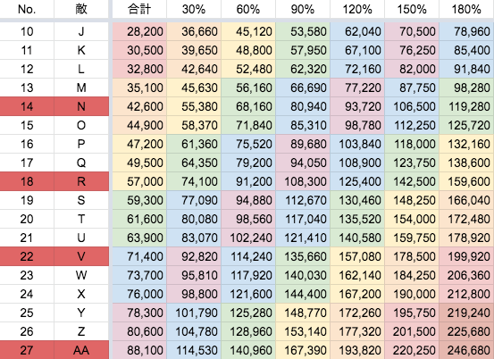撃破数と増加礼装での獲得ポイント数を表にまとめました。
