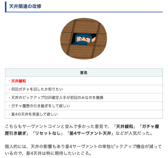 サーヴァントコイン関連、天井、あのサーヴァント実装して!などが特に多かった印象です。