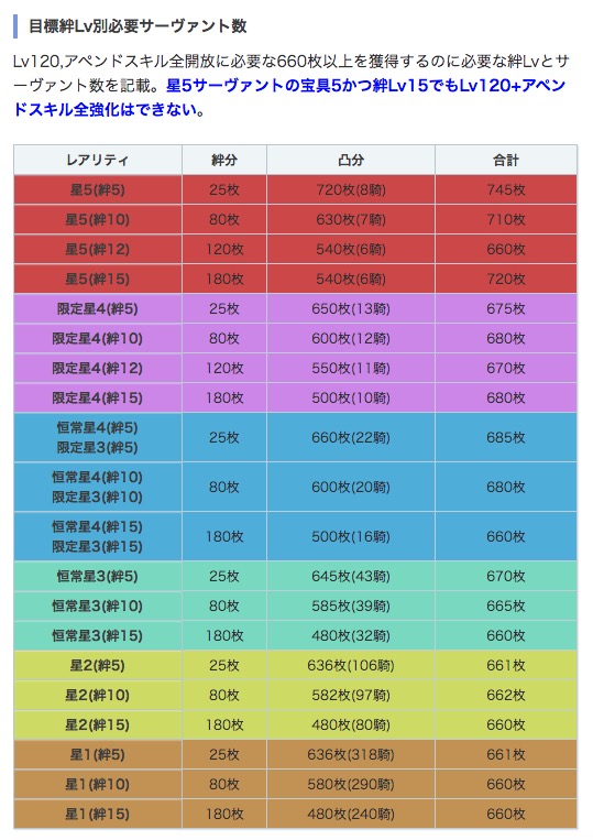 ちょっと見辛いですが、各レアリティごとのアペンド&レベル完全開放に必要な絆レベル、ガチャ排出数をまとめました。