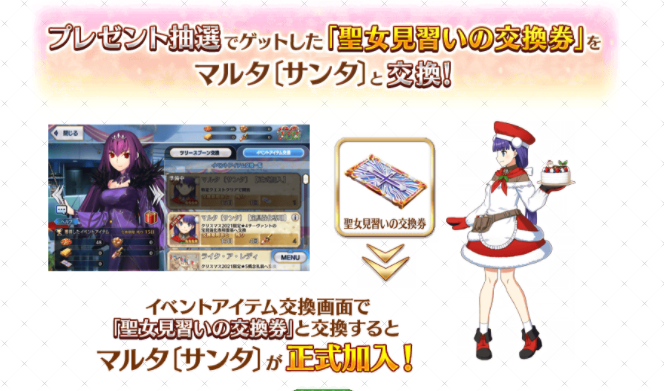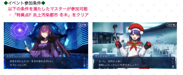 "本イベント期間中の新規サーヴァントは、イベント限定サーヴァント「★4(SR)マルタ〔サンタ〕」のみの1騎限定"