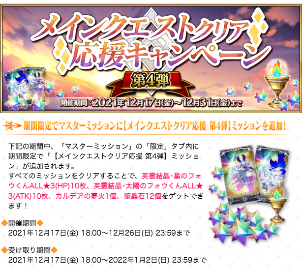 メインクエストクリア応援キャンペーン 第4弾の報酬は夢火1個、聖晶石12個!