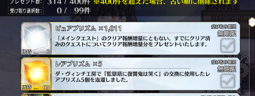 ピュアプリズムですが、今後はメインストーリーのクリア報酬(聖晶石とかの枠に追加される)で獲得できるようです!