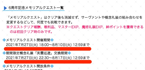 6周年メモリアルクエストですが、なんだかんだ来週の火曜に終わっちゃうのでお忘れなく!