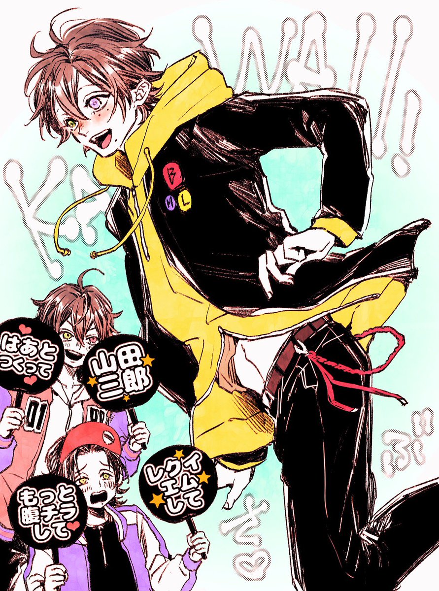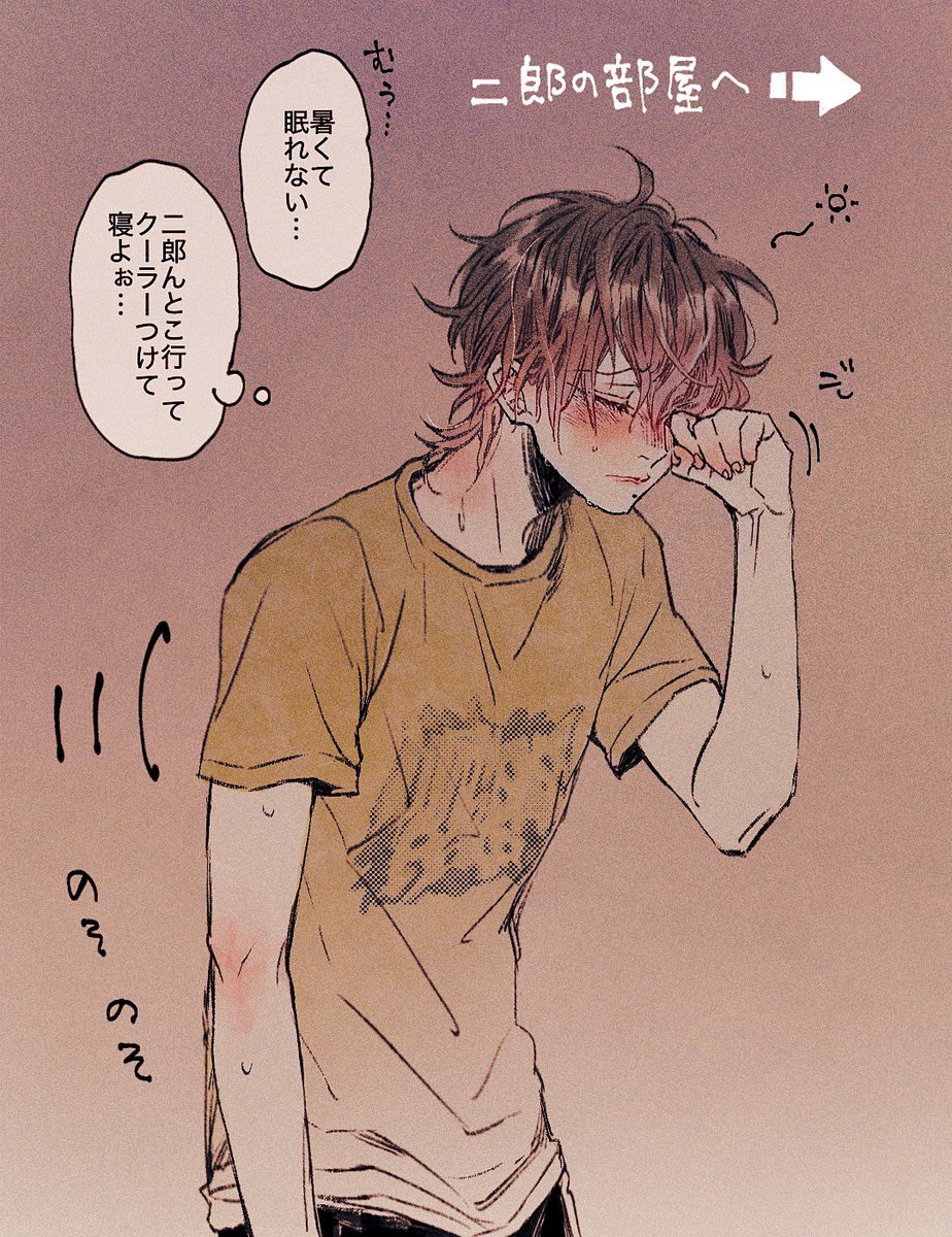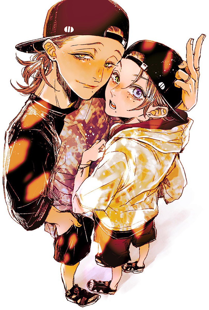 お題箱から、じろの膝の上にさぶがのって一緒に扇風機浴びてる夏のじろさぶ🌻🧢🐥とても可愛い…な…🤤