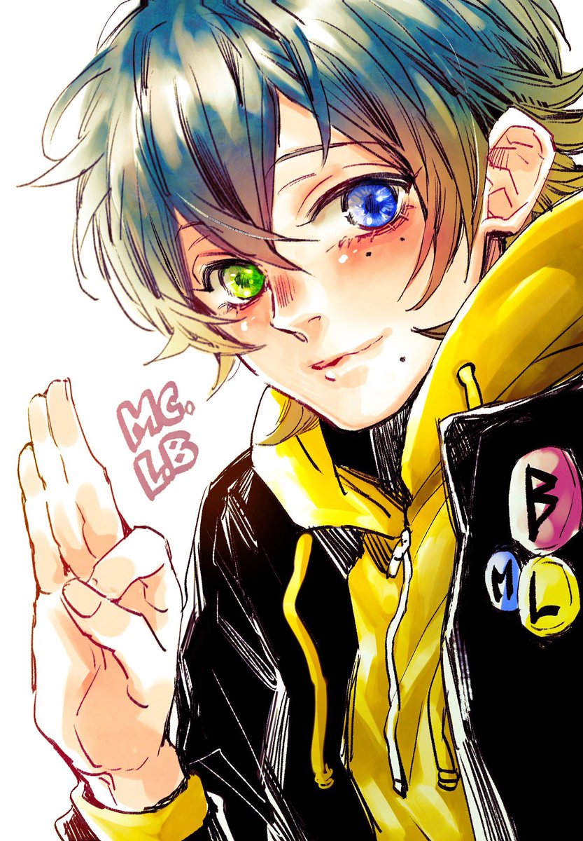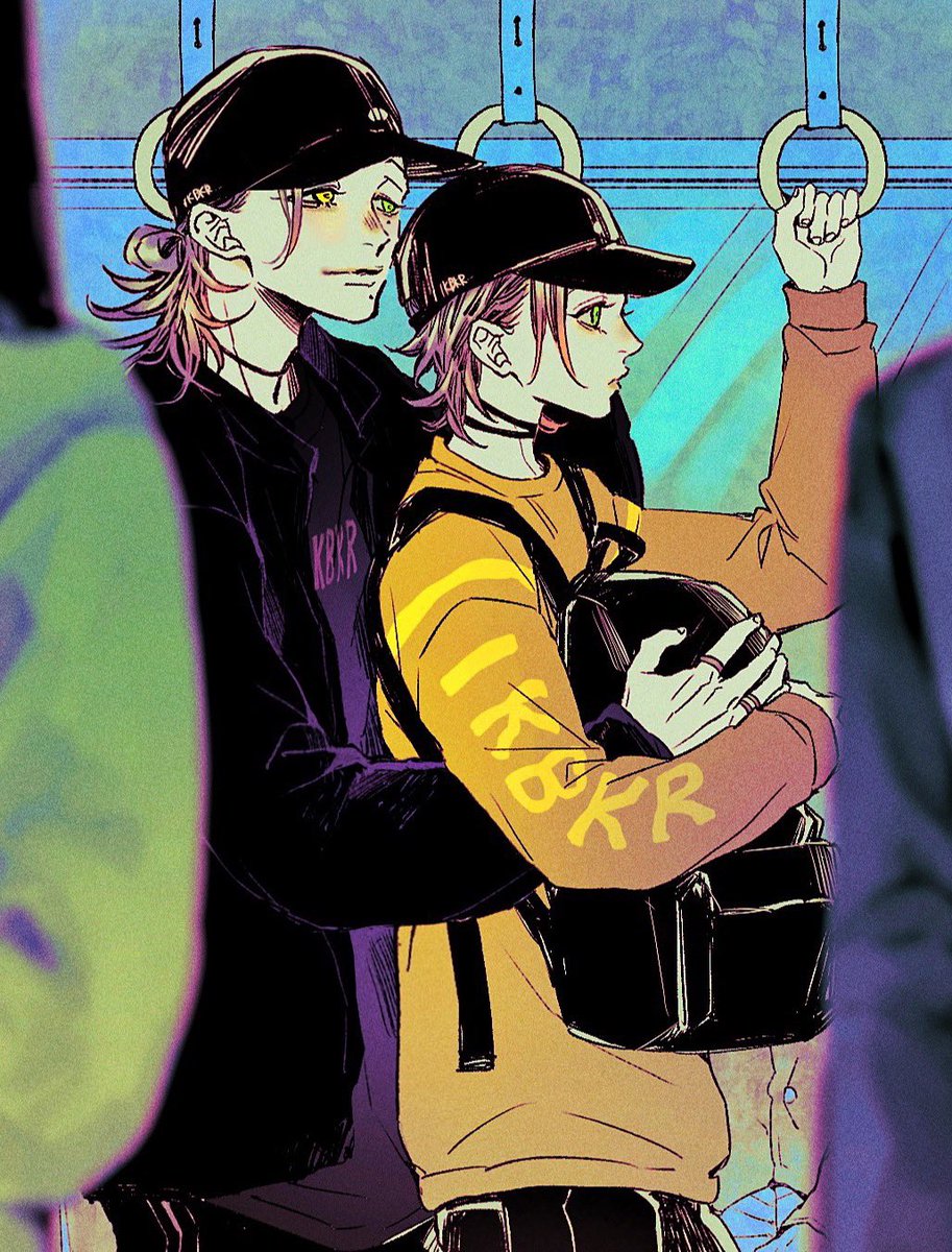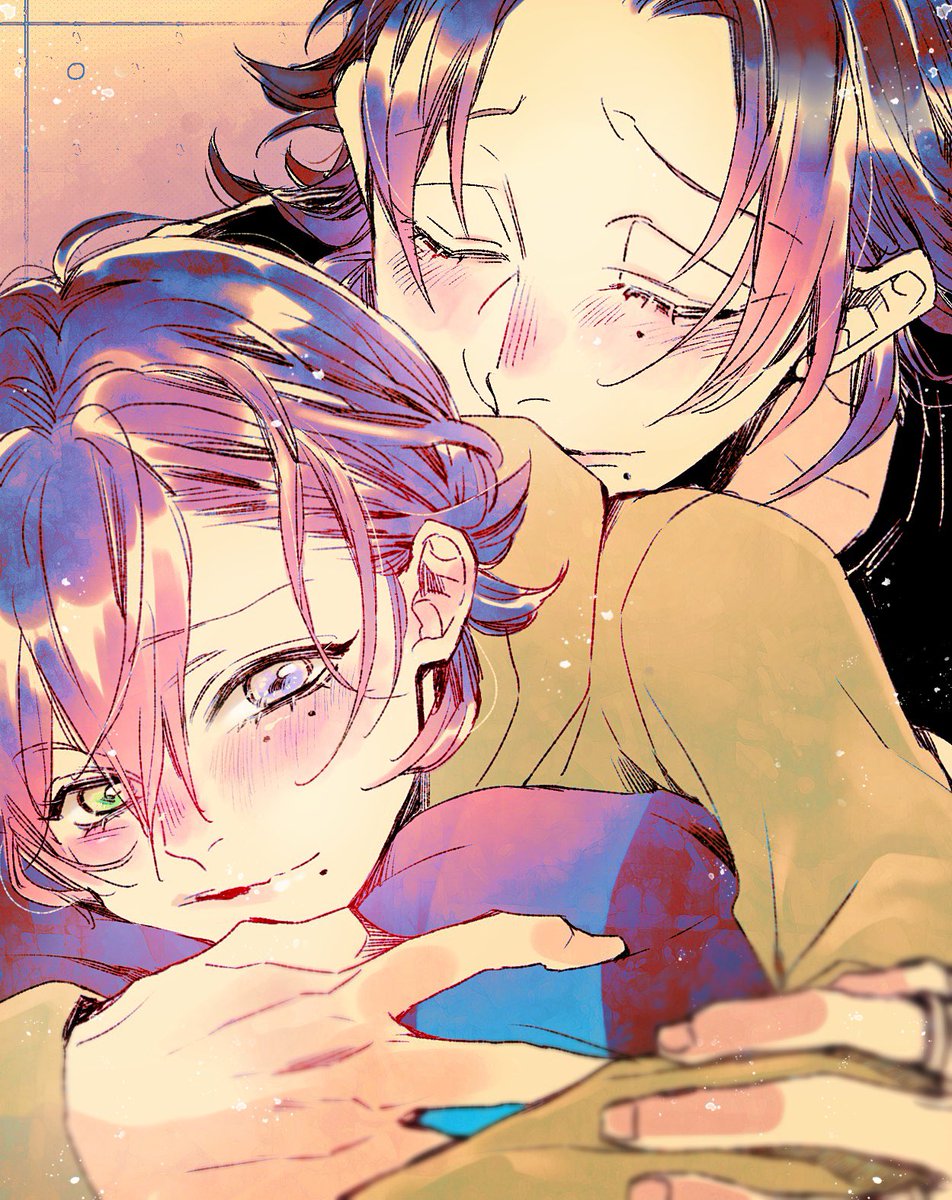 お題箱から、じろの膝の上にさぶがのって一緒に扇風機浴びてる夏のじろさぶ🌻🧢🐥とても可愛い…な…🤤