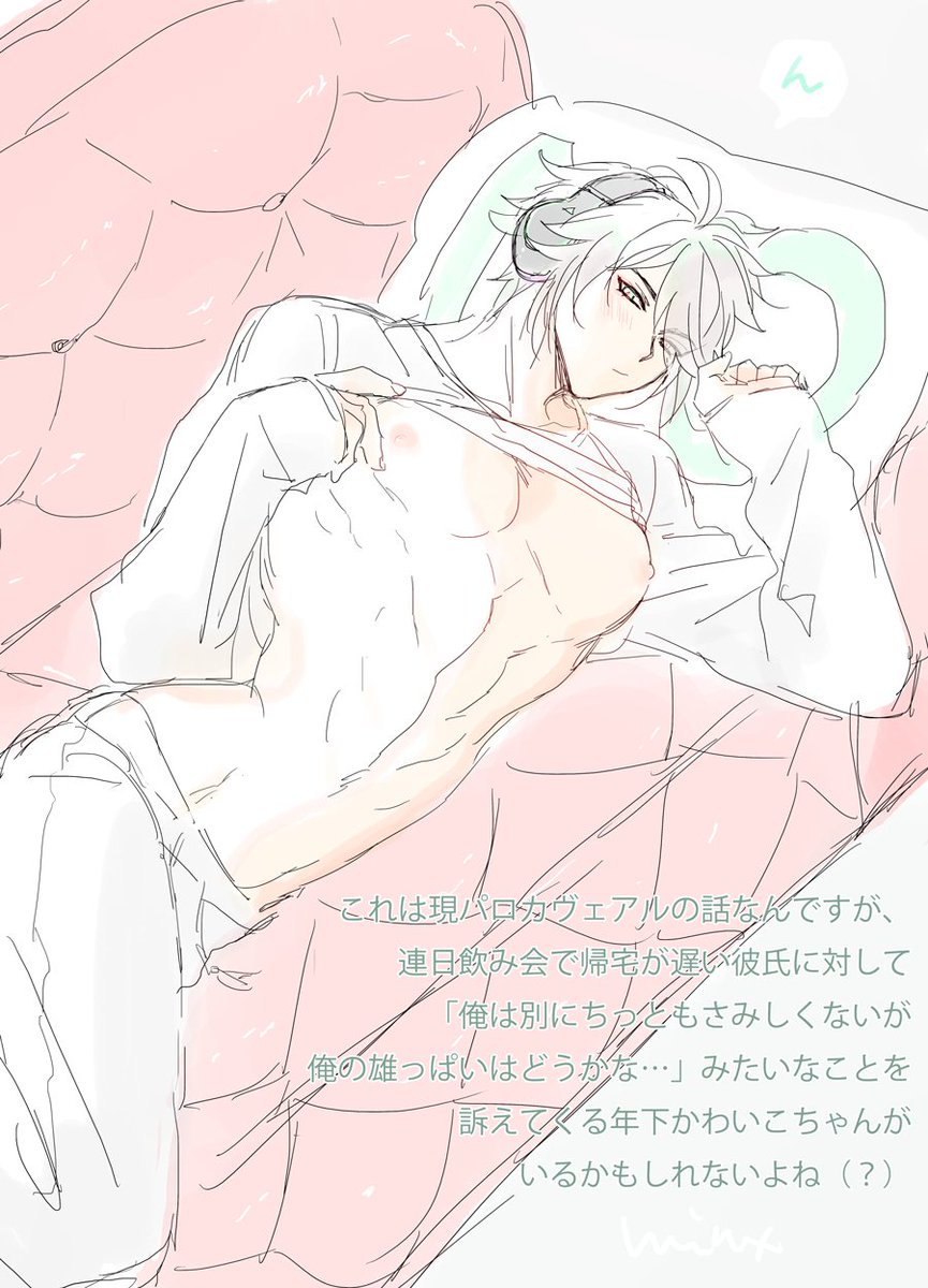 連日飲み会で帰りが遅い彼氏に「俺は別にさみしくないが俺の雄っぱいはどうかな…」みたいなポーズしてくる年下かわいこちゃんあるぱいぜん(でも今日は怒ってるからえっちなことはさせてくれない)の妄想をしていた絵(現パロ?)