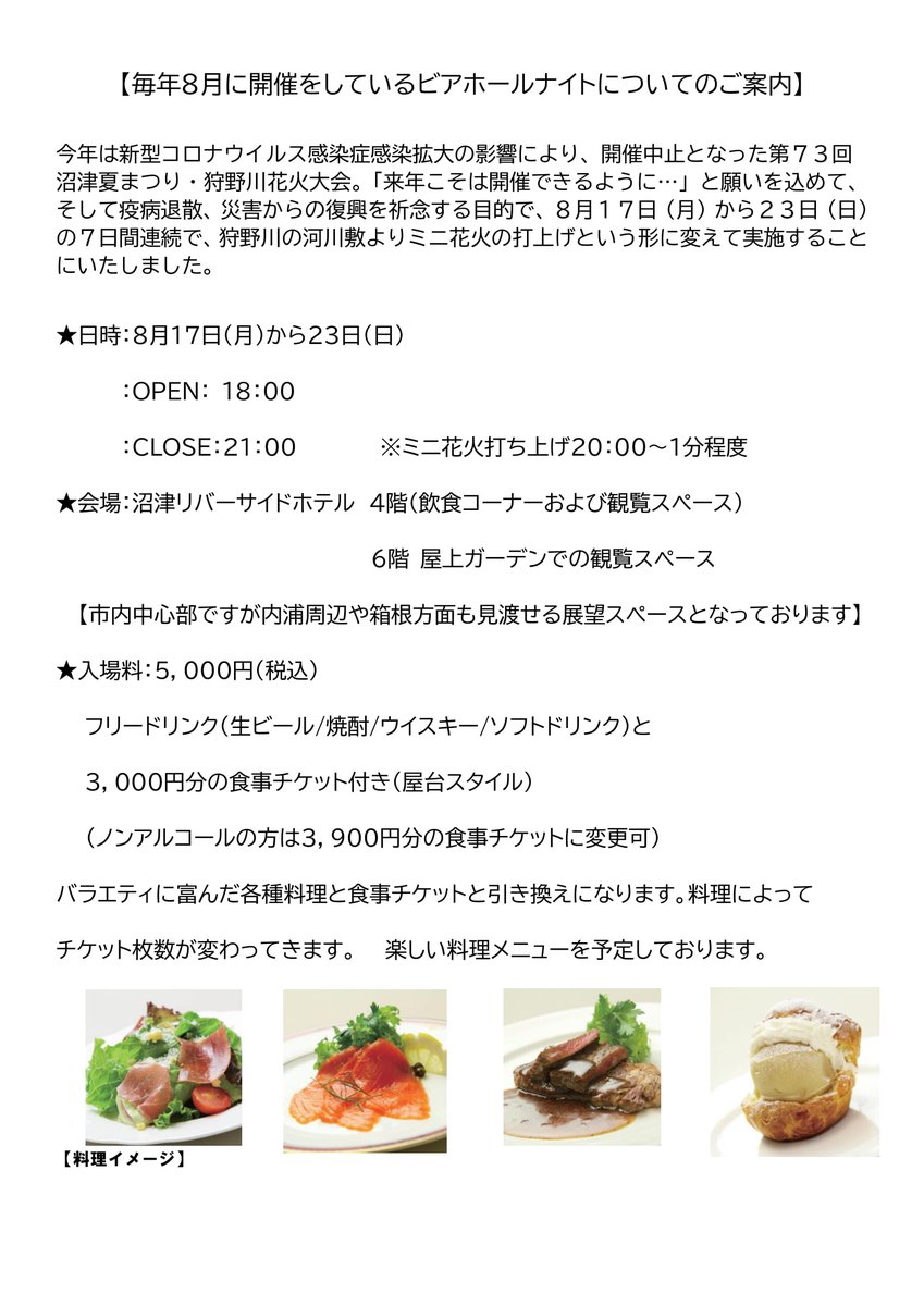 【ご案内】みんなの思いを込めて…毎年8月に開催をしておりますビアホールナイトですが、今年の沼津夏祭り・狩野川花火大会の中止を受けて『来年こそは開催できるように…』という思いを込めて8月17日から23日に掛けてミニ花火打ち上げという形で開催をいたします。 regsys.fun-numazu.net