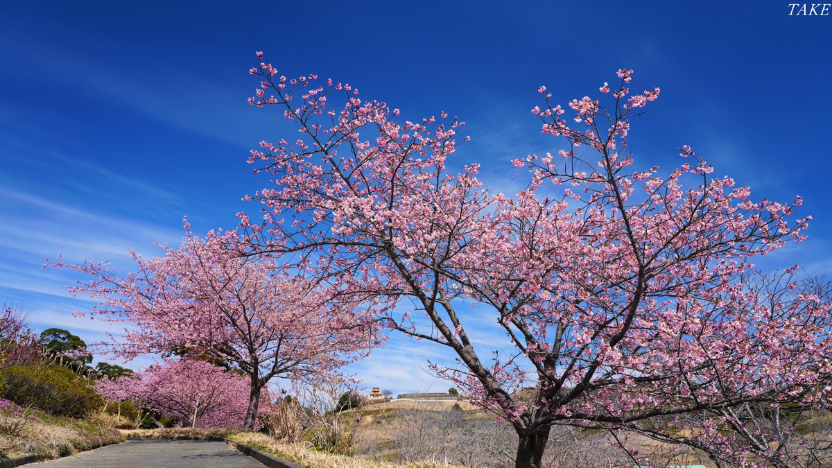立春を迎え穏やかな青空の下 今年も土肥桜が咲き始めました 下向きに咲く桃色の花びらが 色鮮やかで綺麗でした🌸
