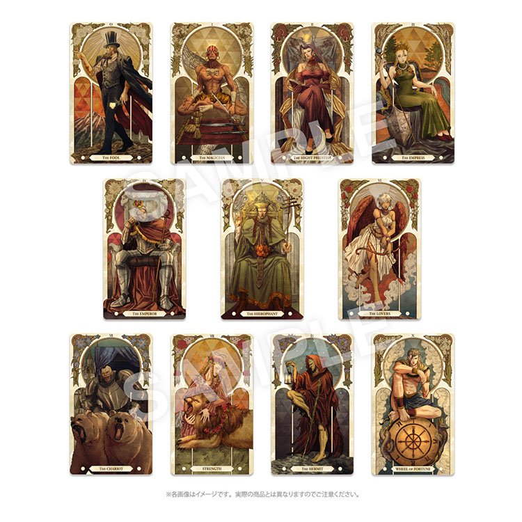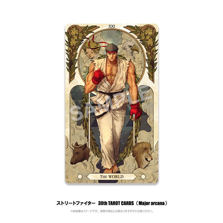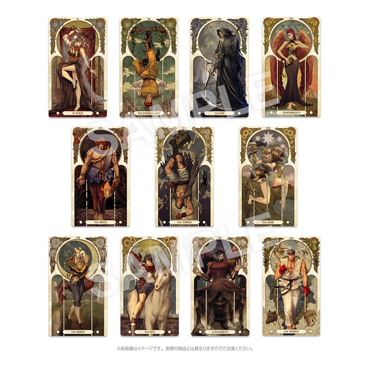 二つ目は、カプコンデザイナー「ヒナナナ」による完全描き下ろしの豪華「タロットカード」! 「正義」「愚者」「皇帝」などをイメージさせる22体の格闘家たちが、大アルカナと呼ばれる22枚のカードになりました!豪華ボックスに入れてお届け!つづく(カナ)