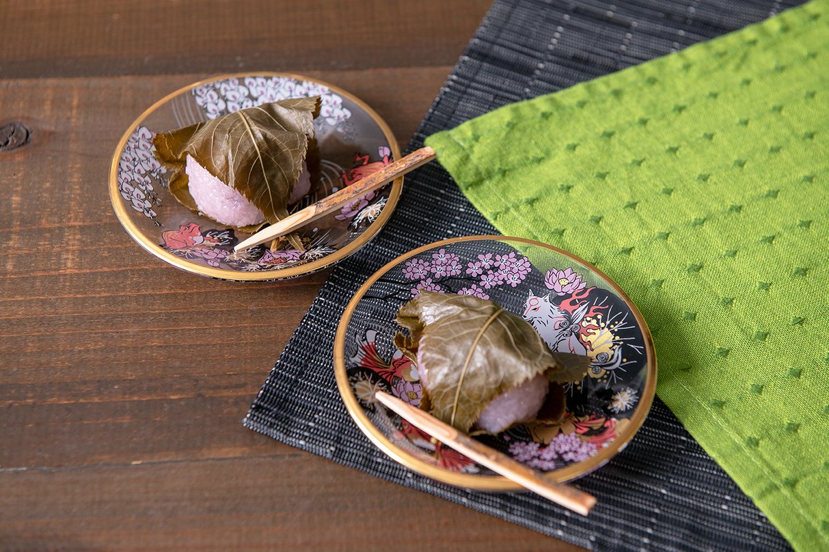 【大神12周年🐾🍀】「島崎麻里」氏の描く、1819年創業のガラス製品の先駆「石塚硝子株式会社」が展開するブランド『ADERIA』と『大神』のコラボ食器。美しいガラスの小皿は、この時期の和菓子「桜餅」も映えますね🌸