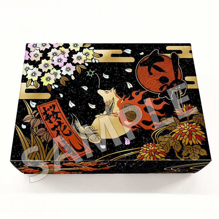 『大神』の象徴でもある太陽と、美しく舞い散る桜の中を疾走する「アマテラス」が描かれた「吉村 健一郎」氏描き下ろしの扇子です。金色でタイトルロゴが箔押しされた、シックな黒箱に入れてお届けいたします🐾 #OKAMI