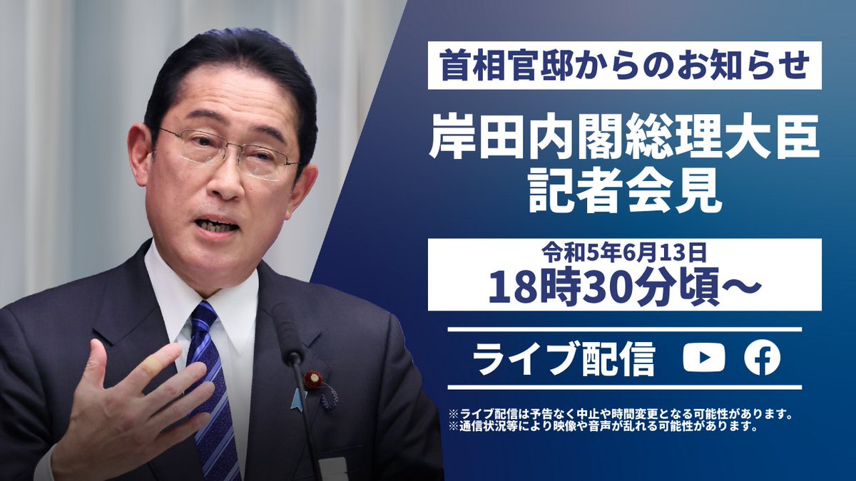 本日(6月13日)18時30分頃より、岸田内閣総理大臣記者会見を下記SNSでライブ配信する予定です。ぜひご覧ください。