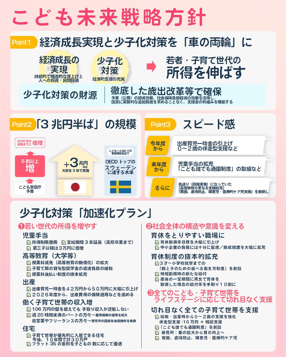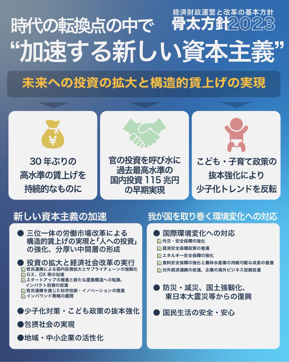 本日、「こども未来戦略方針」を閣議決定いたしました。少子化は我が国の社会経済全体に関わる先送りのできない「待ったなしの課題」 です。経済成長と少子化対策を「車の両輪」として、規模とスピード感をもって実行してまいります。