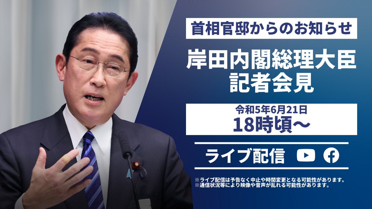 本日(6月21日)18時頃より、岸田内閣総理大臣記者会見を下記SNSでライブ配信する予定です。ぜひご覧ください。