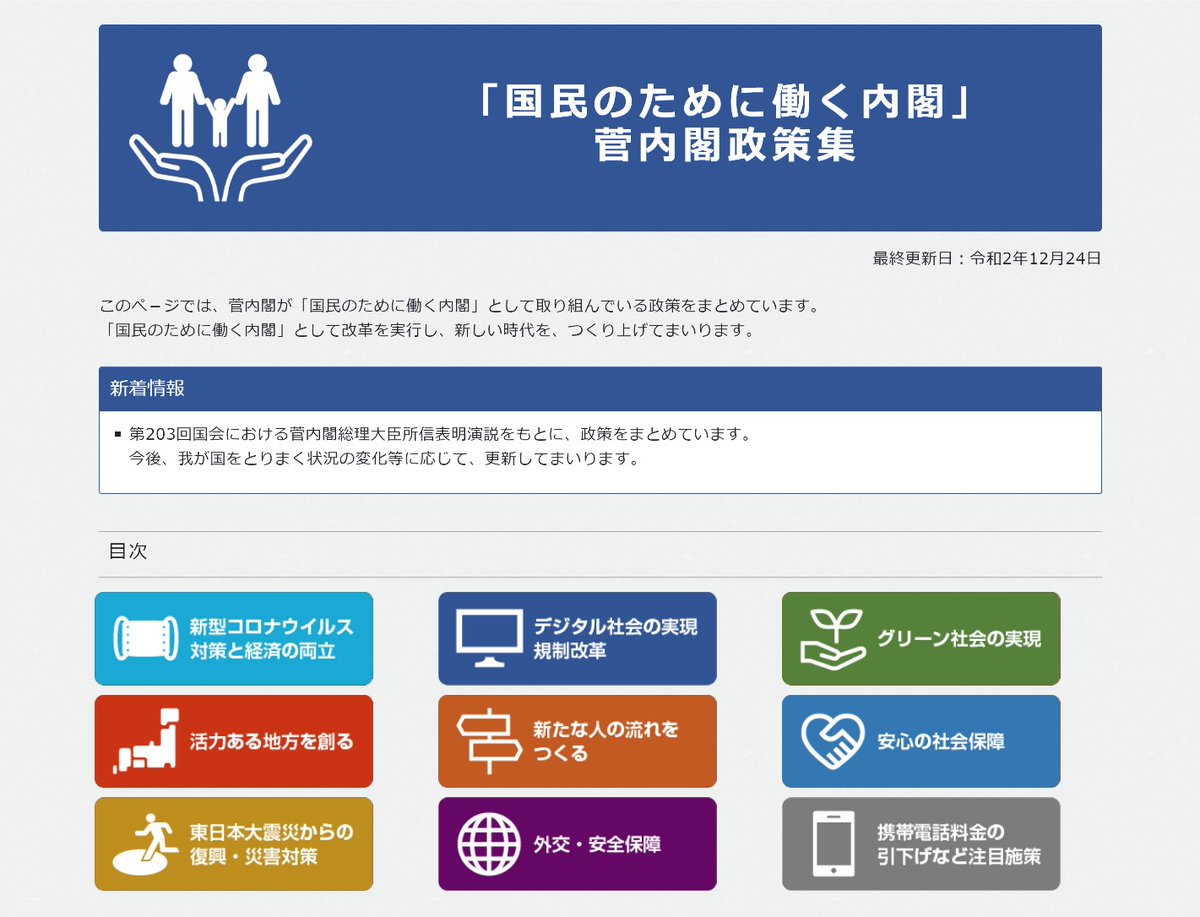 【お知らせ】菅内閣が「国民のために働く内閣」として取り組んでいる政策をまとめたページを開設しました。「国民のために働く内閣」として改革を実行し、新しい時代を、つくり上げてまいります。kantei.go.jp/jp/headline/to…
