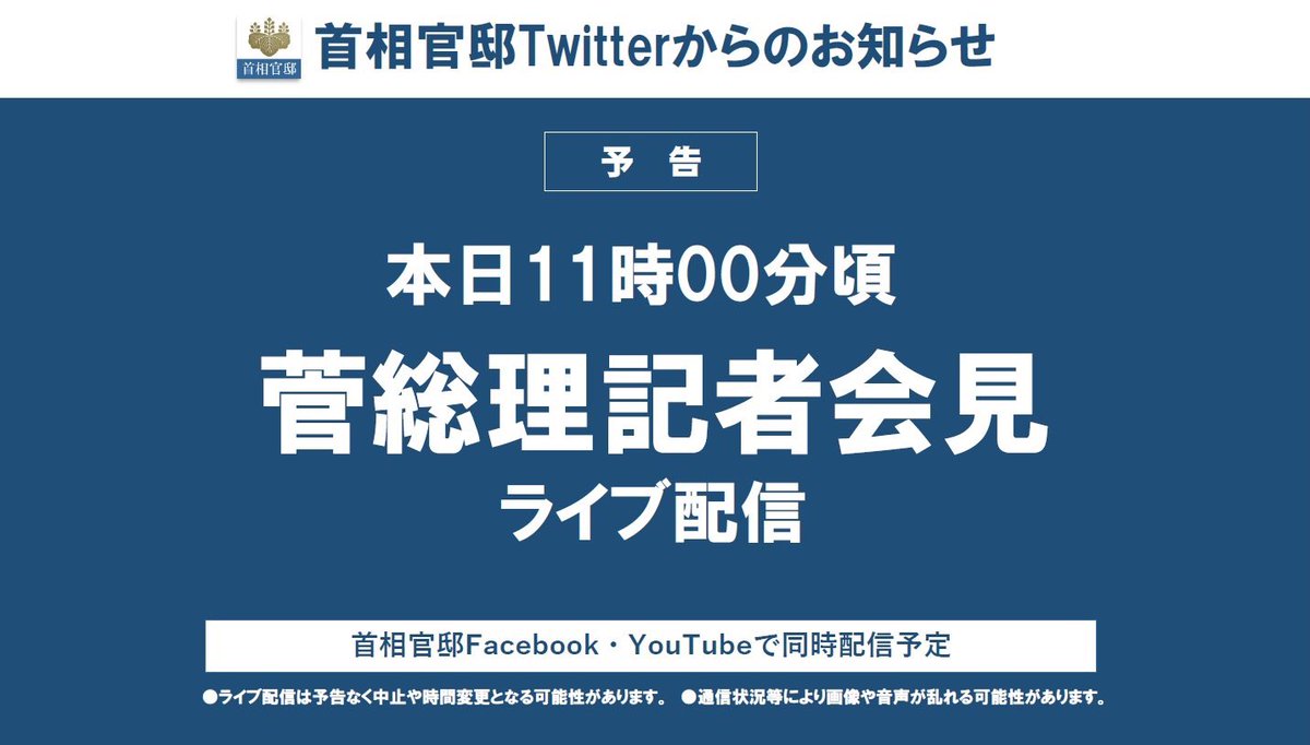 【お知らせ】本日(1月4日)11時00分頃より、菅総理の記者会見を下記SNSでライブ配信する予定です。ぜひご覧ください。