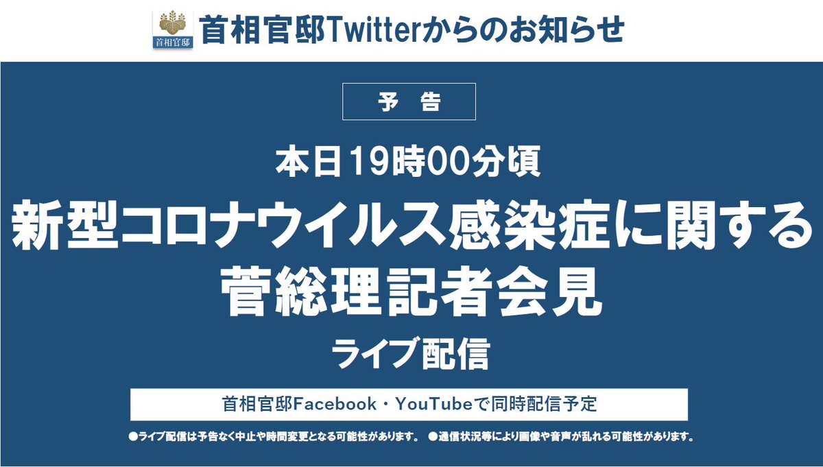 【お知らせ】本日(1月7日)18時00分頃より、菅総理の記者会見を下記SNSでライブ配信する予定です。ぜひご覧ください。