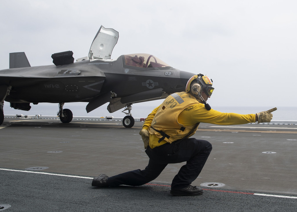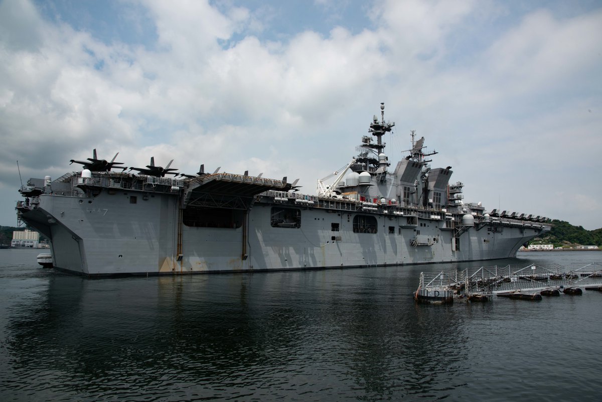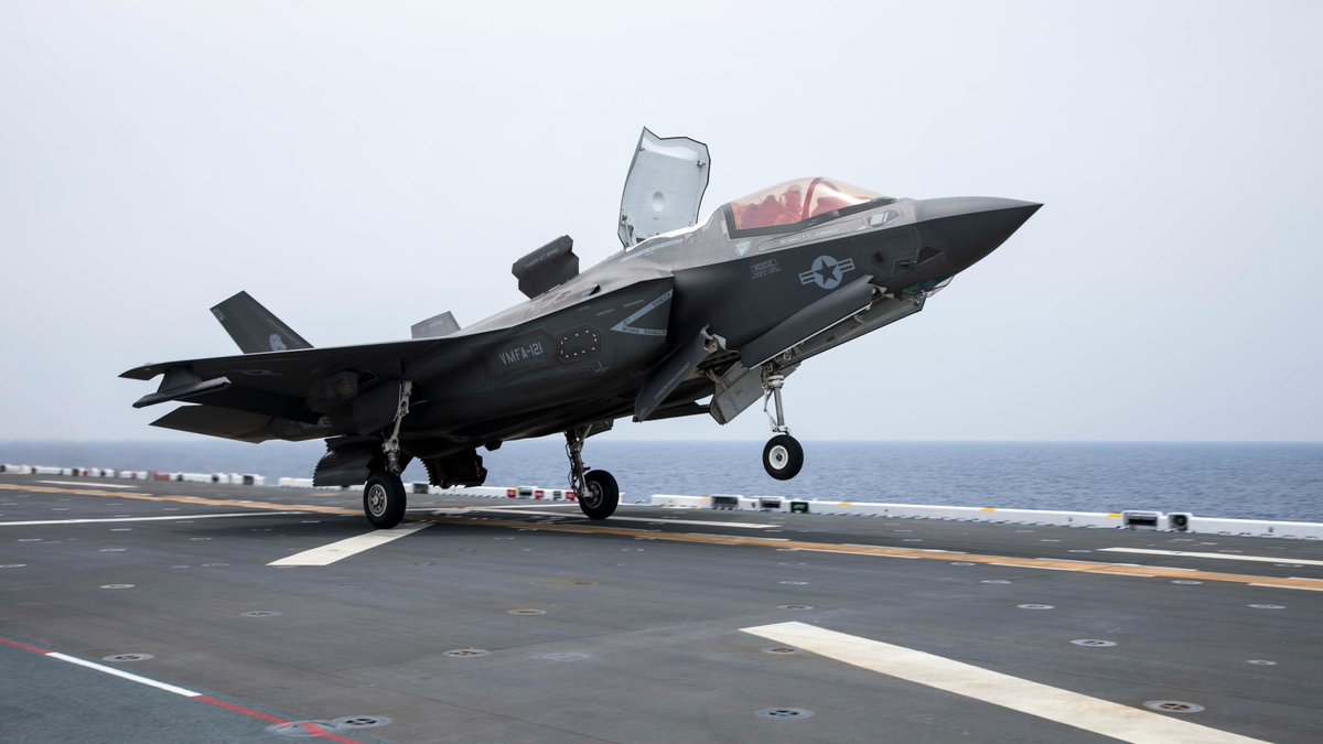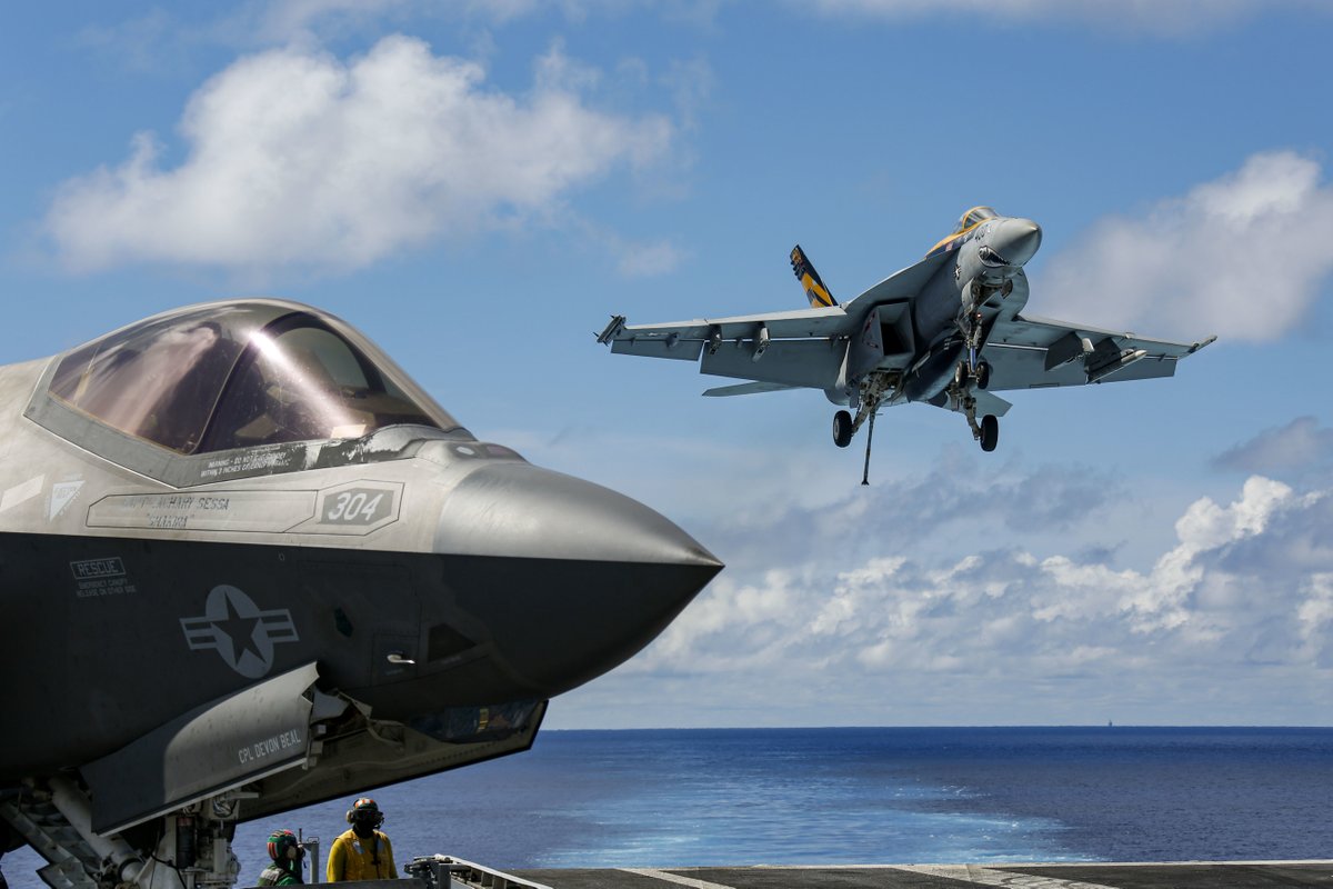 そしてこちらは強襲揚陸艦トリポリの飛行甲板から発艦する、海兵隊のF-35Bライトニング。顔を上に向けてちょっとお澄まししているみたいですね。 twitter.com/CNFJ/status/15…
