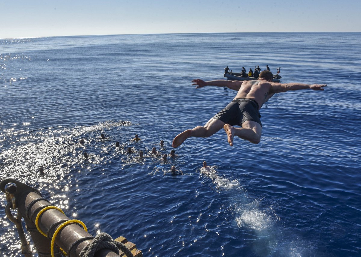 ご挨拶にご紹介した写真は、現在、ジョージ・H・W・ブッシュ空母打撃群の一員として、第6艦隊の担当地域に展開中の誘導ミサイル駆逐艦マハンが、地中海で行ったSwim callの様子。みんな楽しそうです。twitter.com/CNFJ/status/87…