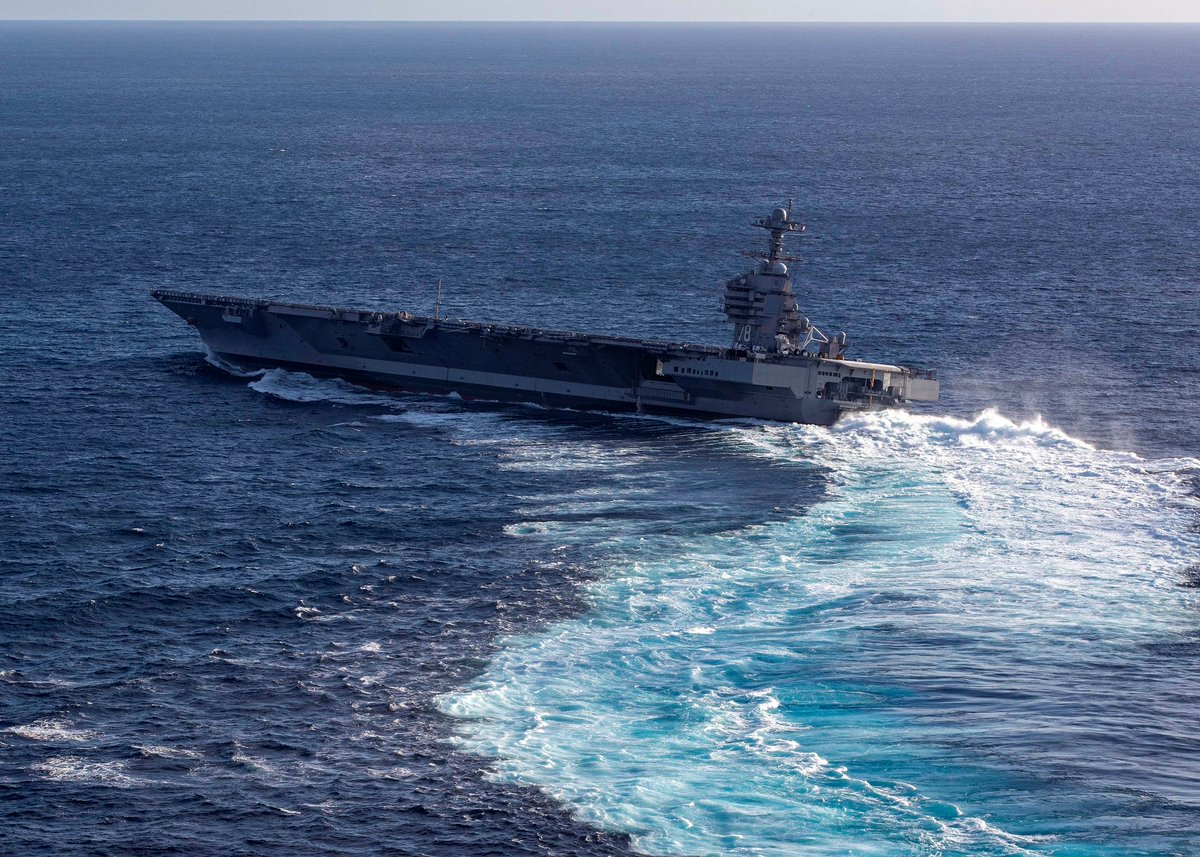 大西洋での洋上試験の一環として、高速ターンを行う空母ジェラルド・フォード。傾き具合がよくわかりますね。 twitter.com/CNFJ/status/11…