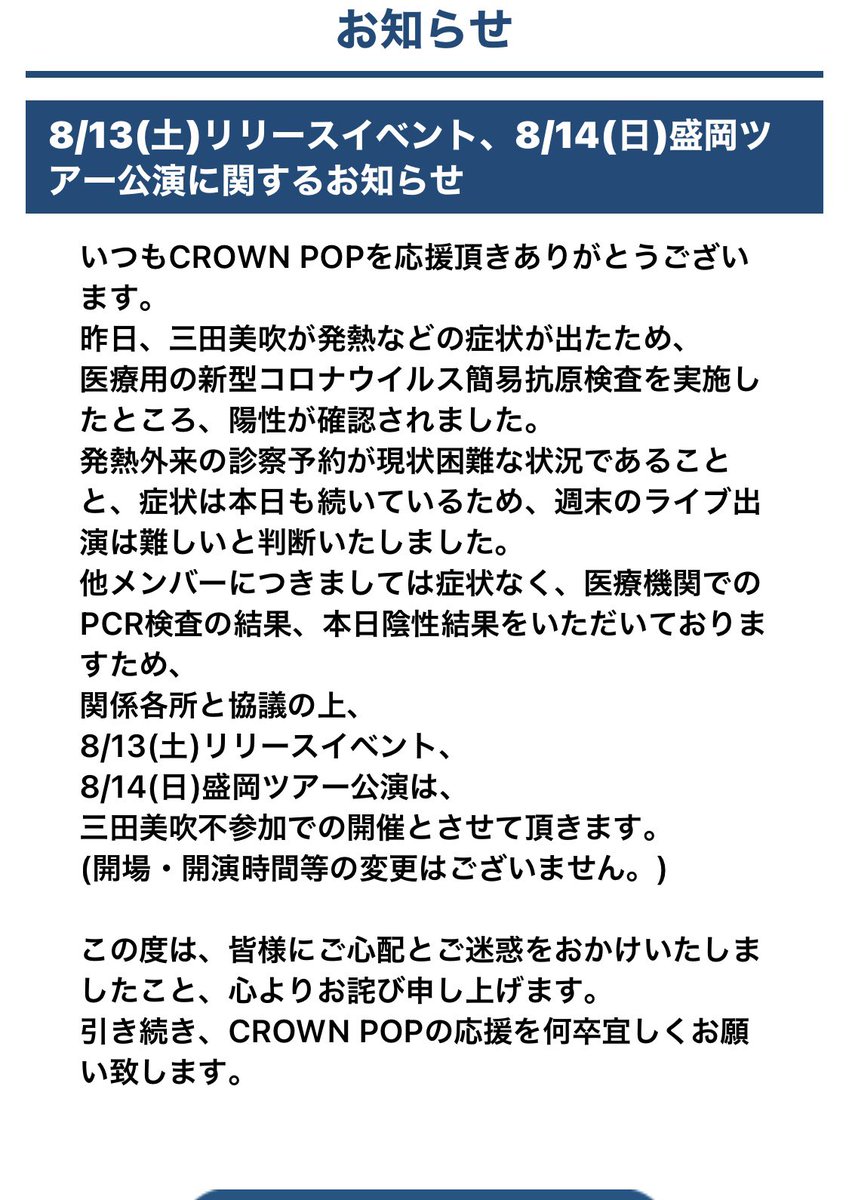 8/7(日)#TIF2022 出演予定だったNGT48さんですが、メンバーの新型コロナウイルス感染に伴う出演キャンセルの為、CROWN POPの出演に変更となりました。