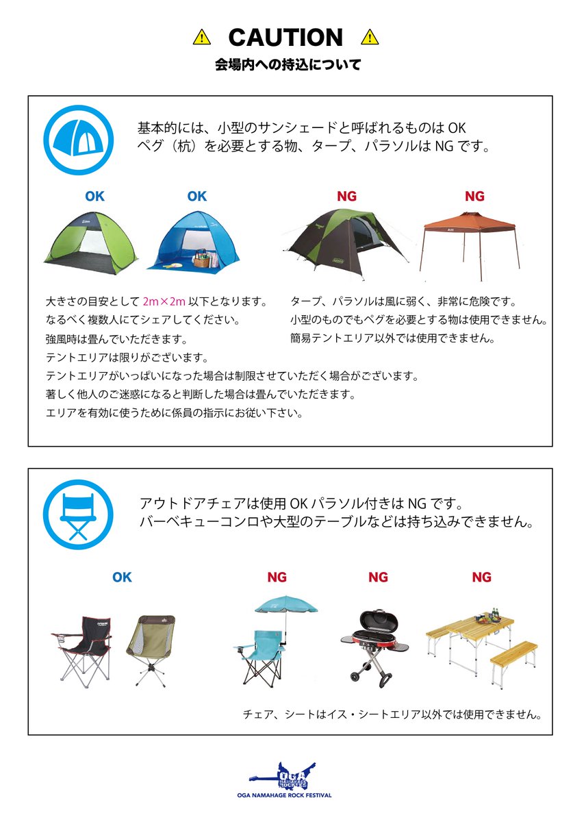 簡易テントや持ち込み物についての注意事項を画像つきでお知らせします。