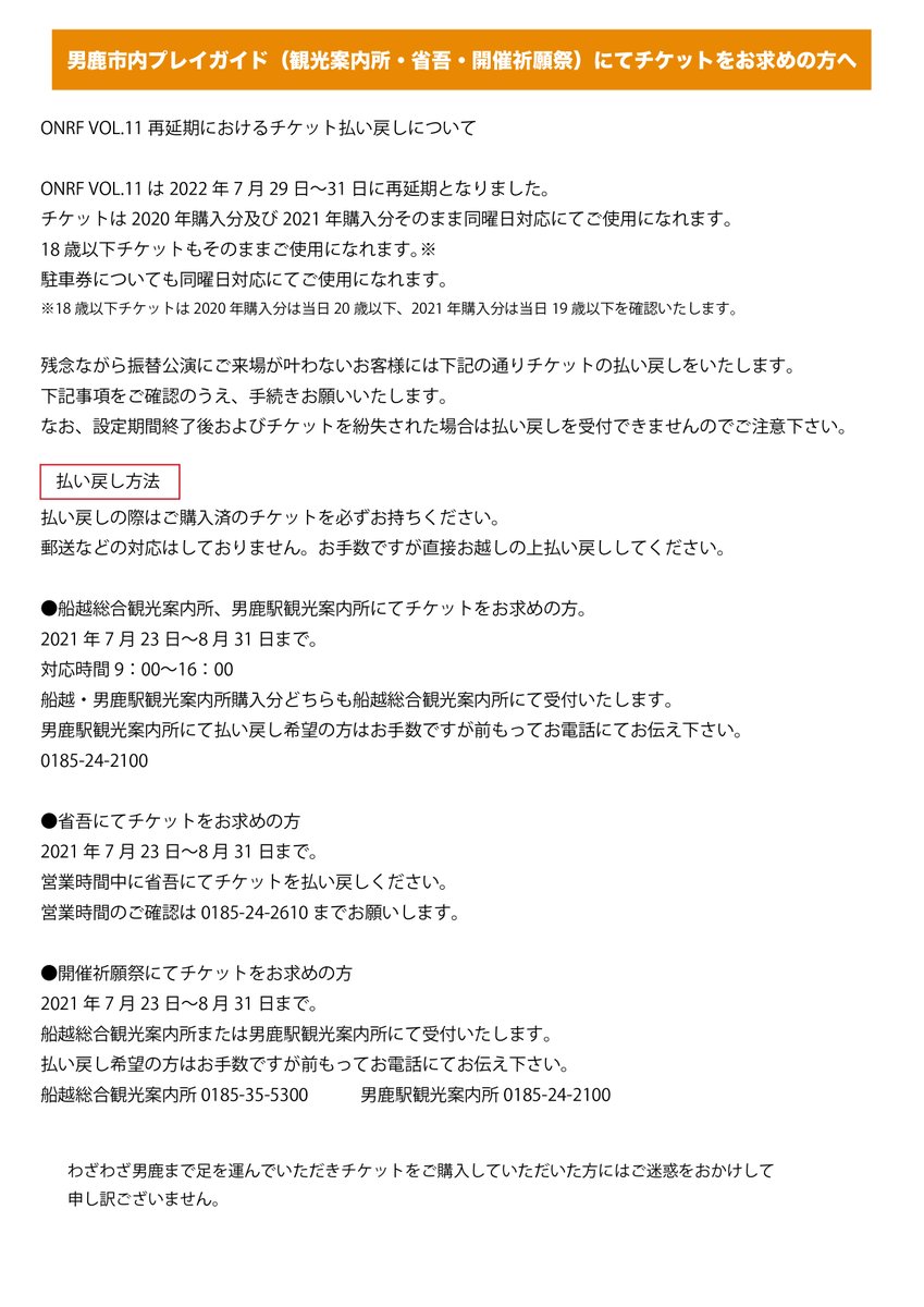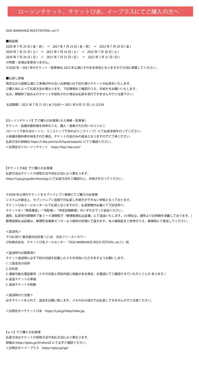 それに伴い、チケットの払い戻しインフォメーションを公開いたしました。