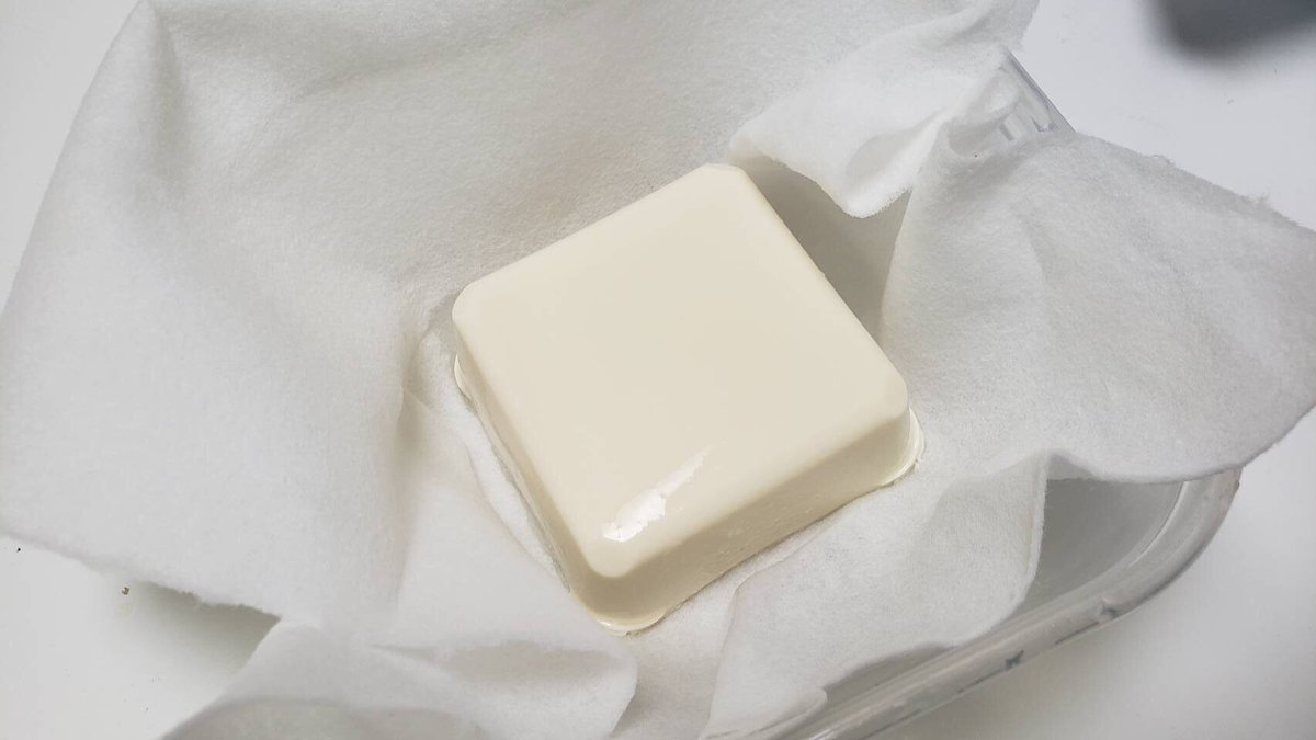 リードクッキングペーパーに絹豆腐150gを包み、めんつゆ大3半、水大1を混ぜたものをかけ、600w5分チンし取り出し5分ほどあら熱をとる