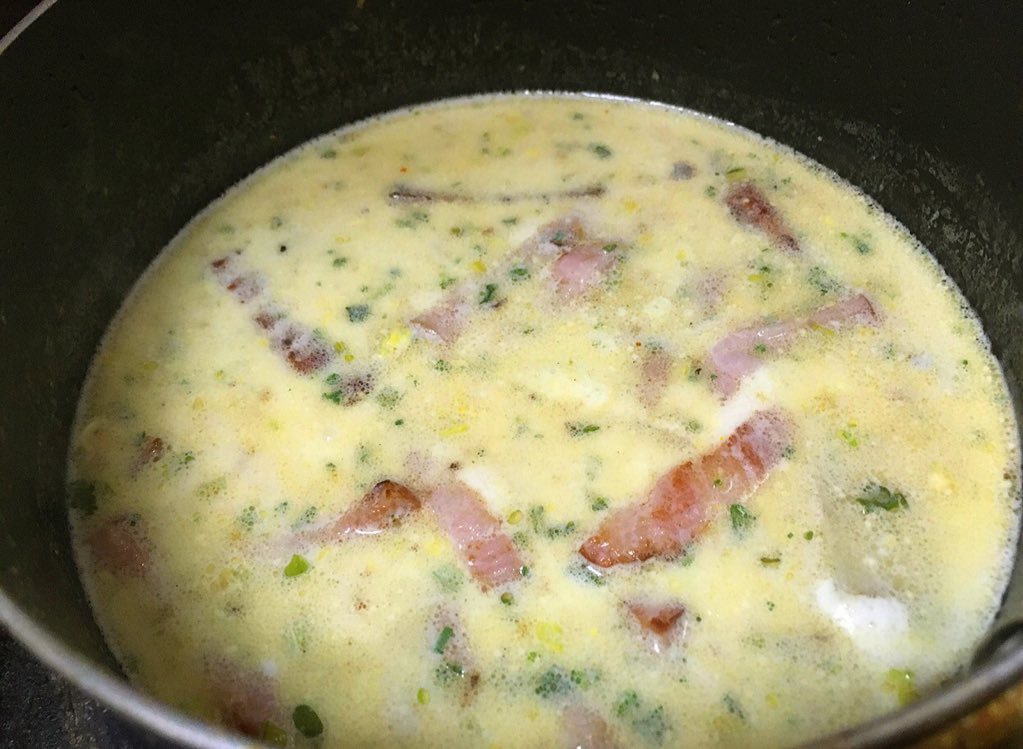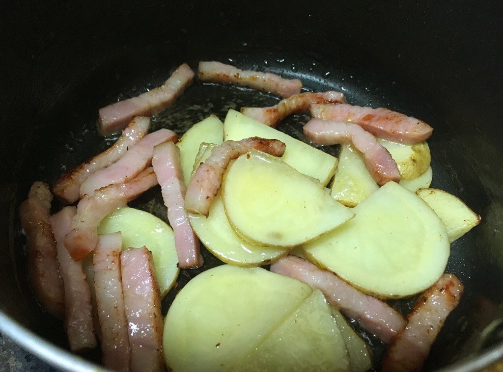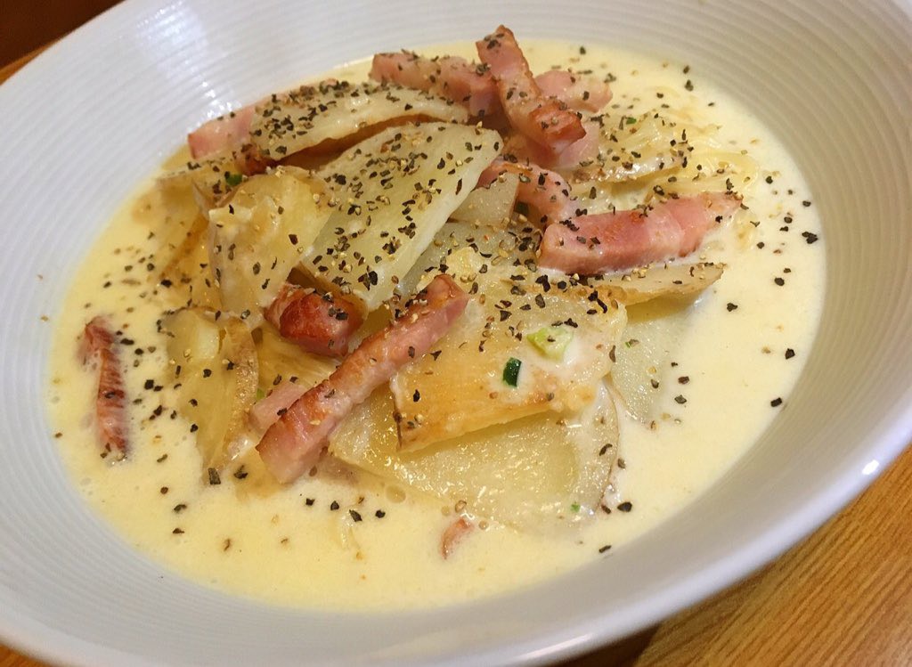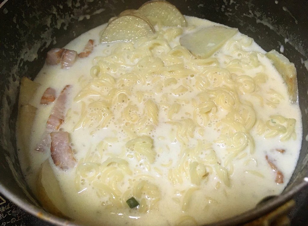 ベーコンと皮付きジャガイモをバターで炒め、牛乳と付属のスープ加えて沸かして麺を入れ、ゆでたら完成!!