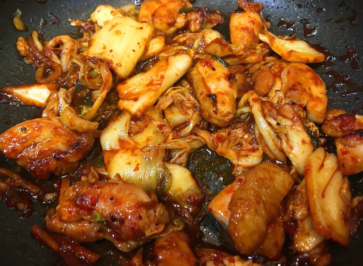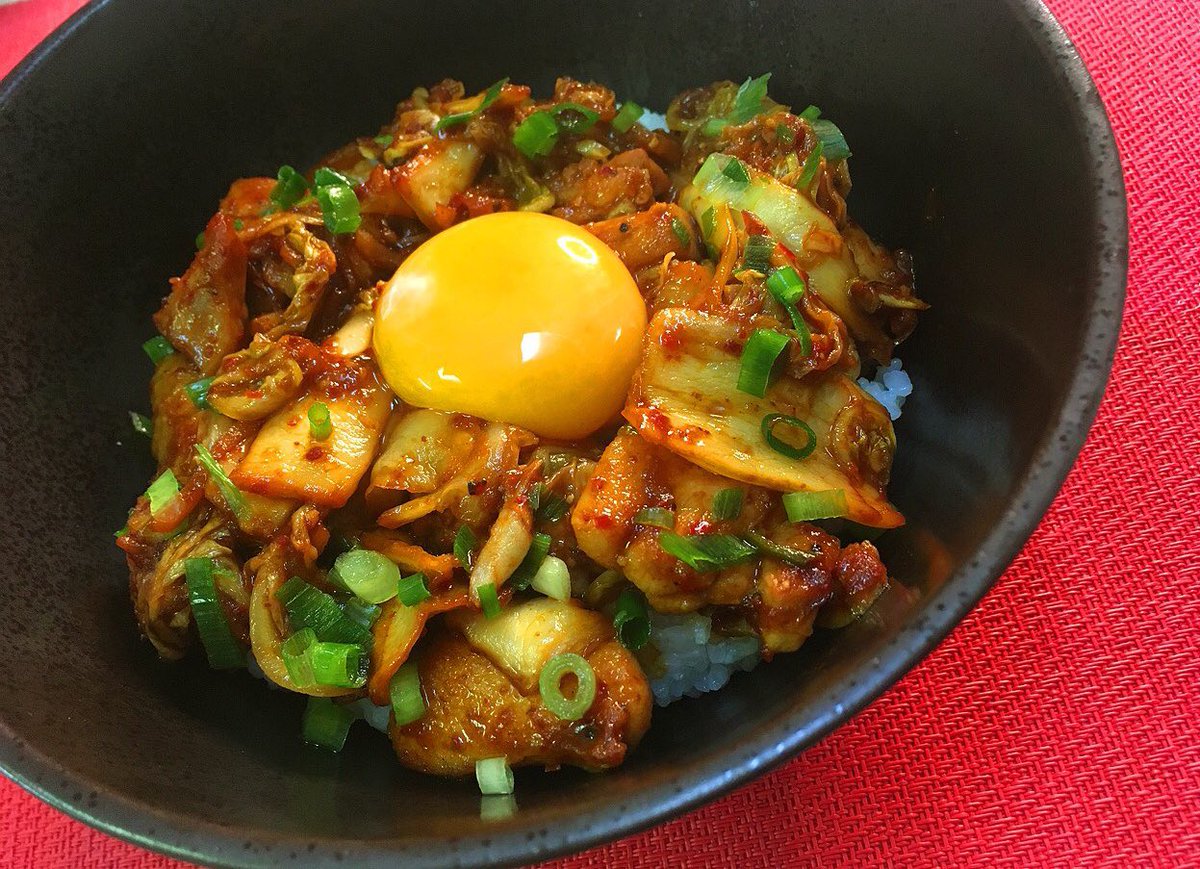 鶏モモ肉をゴマ油で炒め、キムチと焼き肉のタレ、味噌を加えてご飯に盛り、卵黄のっけるだけ