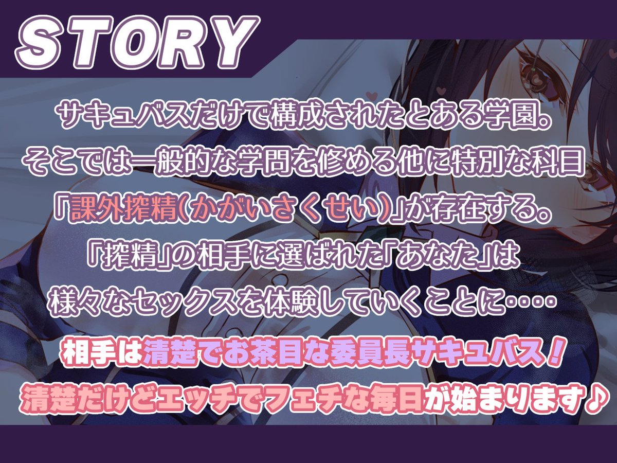 サキュバスだけの学園に招かれて色々な“授業”に協力する過程でイチャラブしていく音声作品を作りました!明るく楽しくラブラブ特化!もちろんいつもの“ヘキ”もたっぷり!今回は気さくで話しやすい委員長を陽向葵ゅかさんのあまあまお声に乗せて、いざ今月15日販売開始予定!