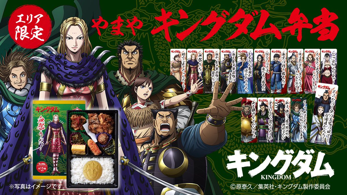 人気TVアニメ「キングダム」とコラボしたお弁当が9/7より期間限定発売!楊端和、蒙武、騰、河了貂、汗明の5種類のお弁当が各種地域限定で登場です🗾