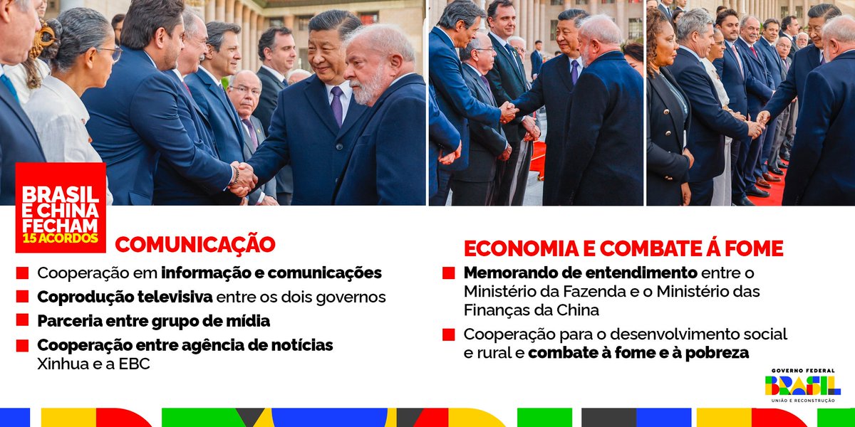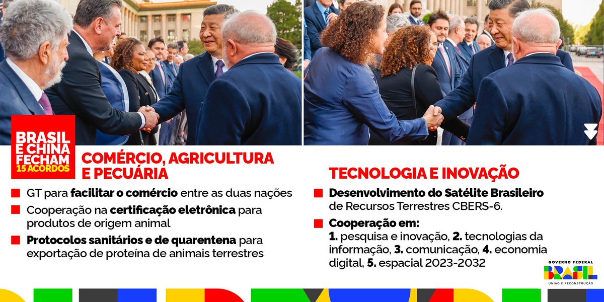 Um novo tempo. O Brasil retoma seu espaço internacional. Na China, fechamos acordos que somam R$ 50 bilhões para áreas como energias renováveis, indústria automotiva, agronegócio, linhas de crédito verde, tecnologia da informação, saúde e infraestrutura. 🇧🇷🤝🇨🇳