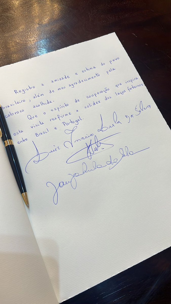 "Registro a amizade e estima do povo brasileiro, além do meu agradecimento pela calorosa acolhida. Que o espírito de cooperação que inspira esta visita reafirme a solidez dos laços fraternos entre Brasil e Portugal". Presidente @LulaOficial no livro de visitas do Palácio de Belém