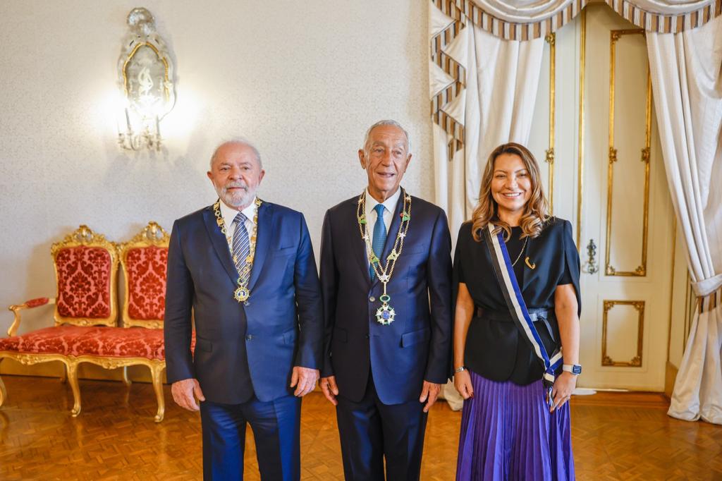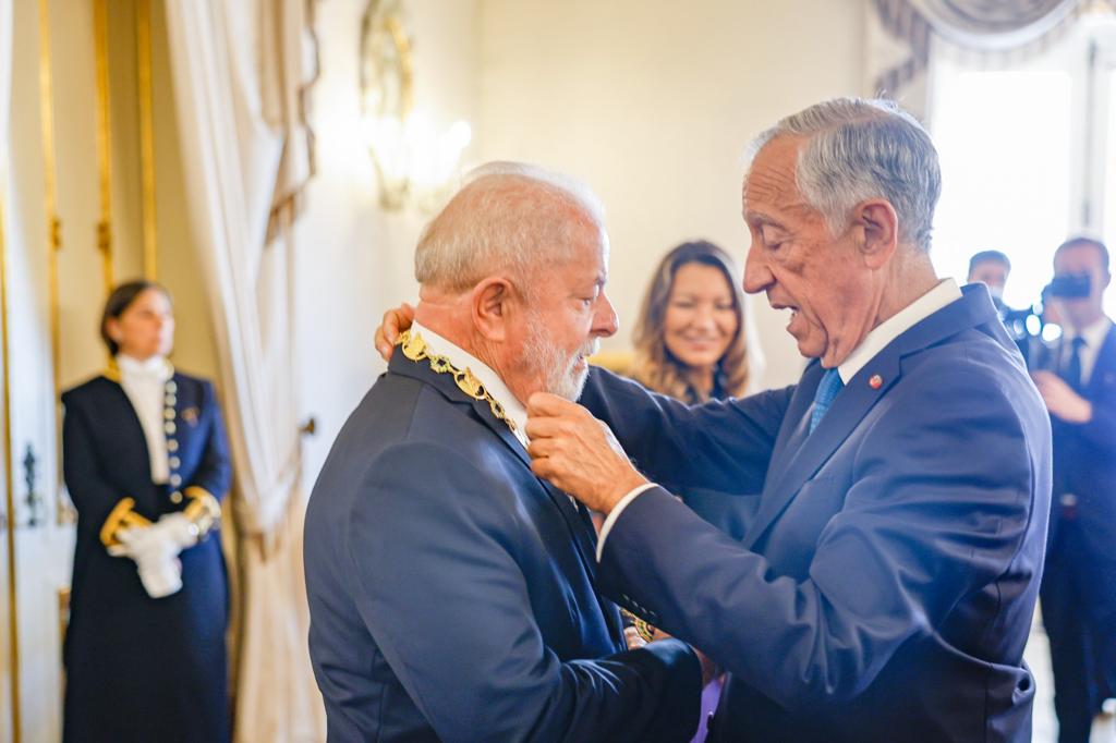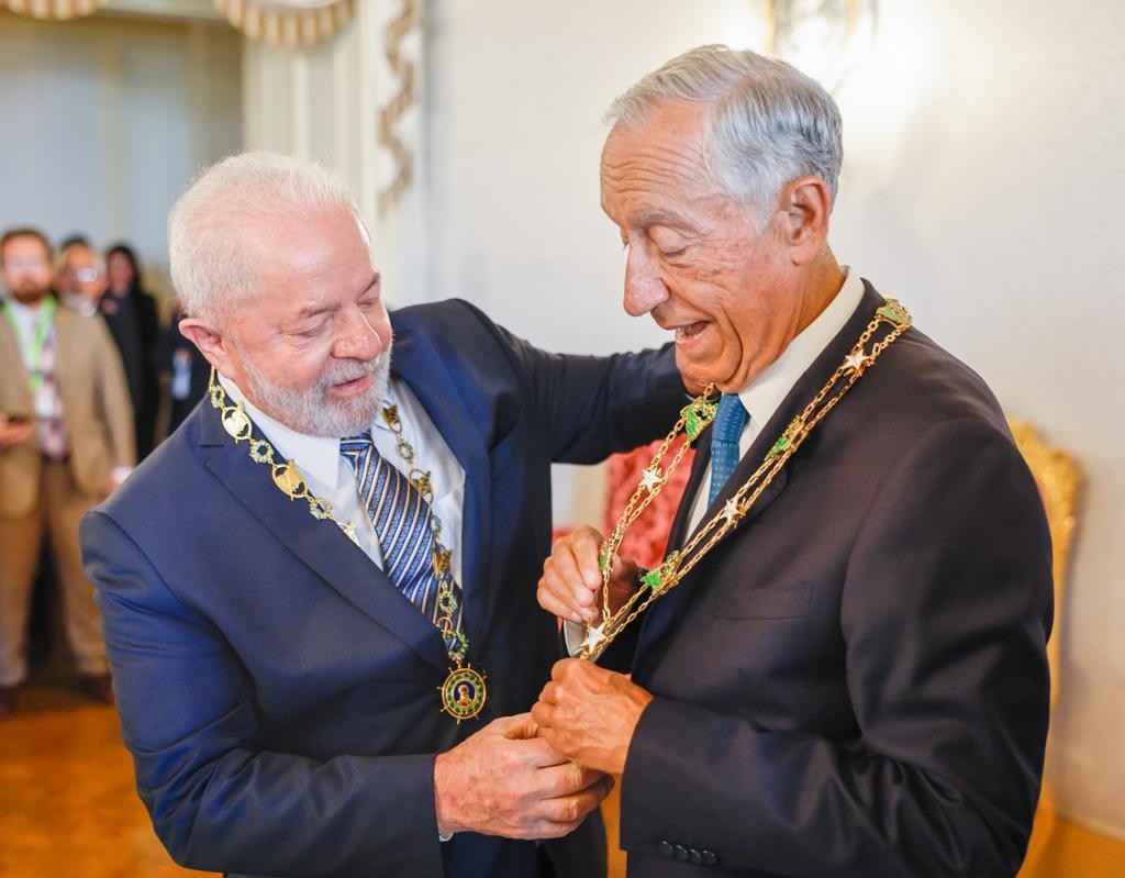 O presidente português Marcelo Rebelo de Sousa oferece o Grande Colar da Ordem de Camões ao presidente @LulaOficial e a Grande Cruz da Ordem do Infante Dom Henrique a @JanjaLula. O presidente
