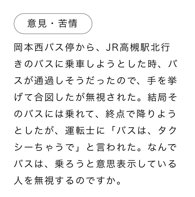 毎月出る高槻市営バスのお客様の声は、クレームがいかに盛ったり作ったりしてるかってのが可視化されてる点からも興味深い。