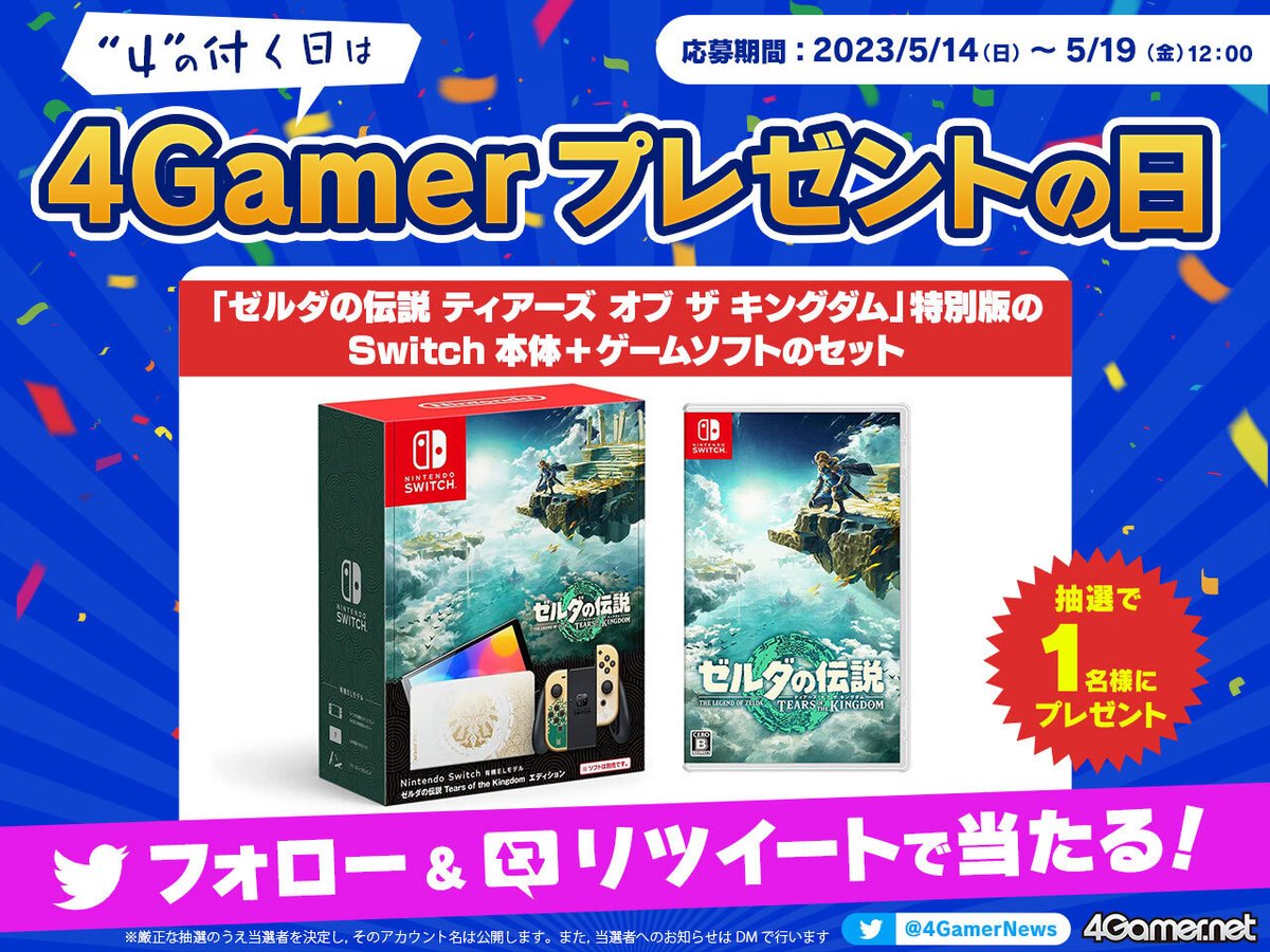 今回はSwitch本体「ゼルダの伝説 ティアーズ オブ ザ キングダム エディション」を1名様にプレゼント🎁