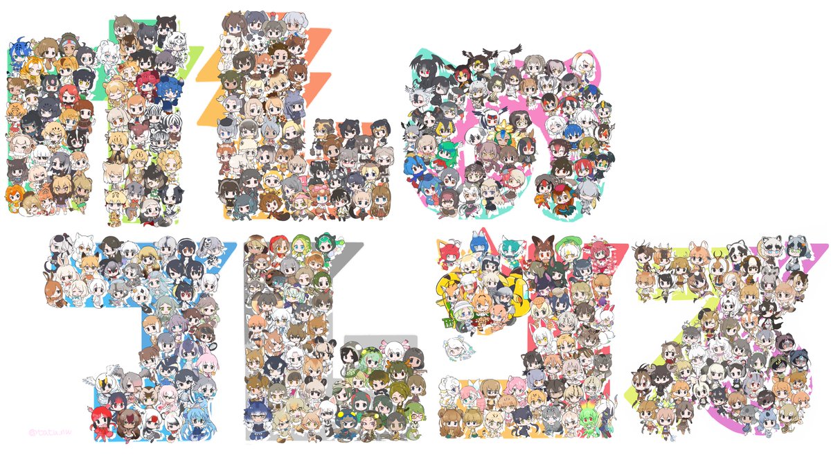 上野動物園の方は2016年の夏、もう一枚はアプリ終了の12月14日(の数日後)に上げた、コラボキャラのケロロ小隊5人と攻殻機動隊のタチコマたち6人、計11人を除いた354人のフレンズと、女王.ビースト三人.バスのイラストです。