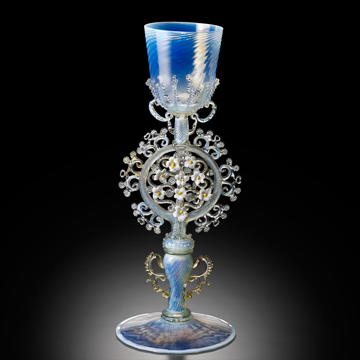 銀イオンを入れた多彩マーブル・グラスの中に、アヴェンチュリン・グラスを斑文様に熔着装飾している。マーブル・グラスは15世紀後半にヴェネチアで作り出されていたが、アヴェンチュリン・グラスの発明は17世紀に入ってからのことであった