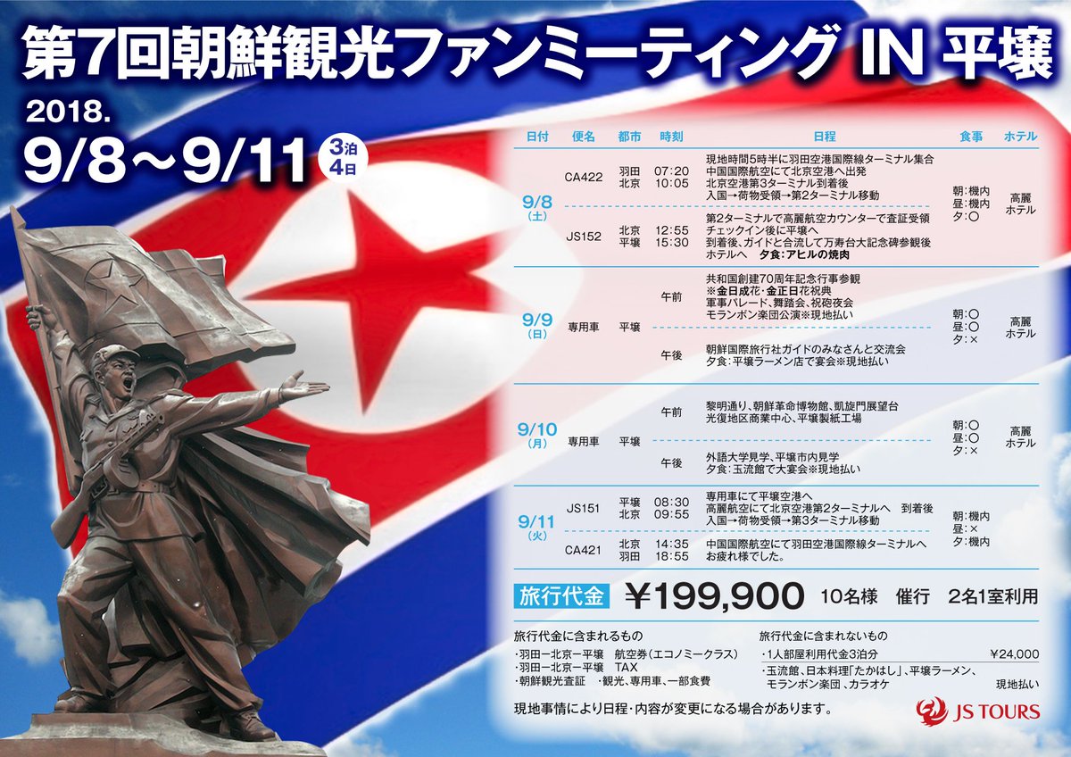 ☆朝鮮民主主義人民共和国創建70周年記念☆第7回朝鮮観光ファンミーティングIN 平壌が開催されます。ついにこの日が来ました! 詳細はお楽しみに!