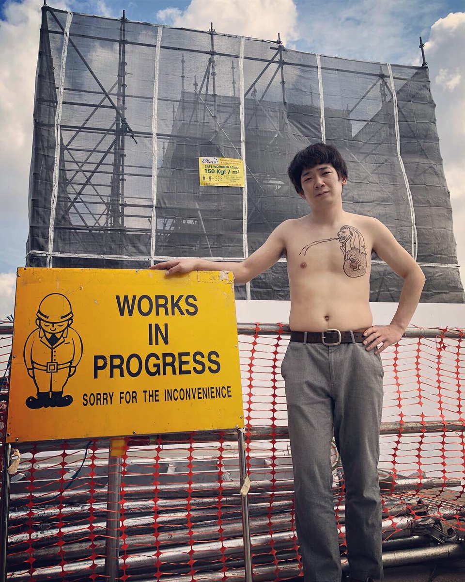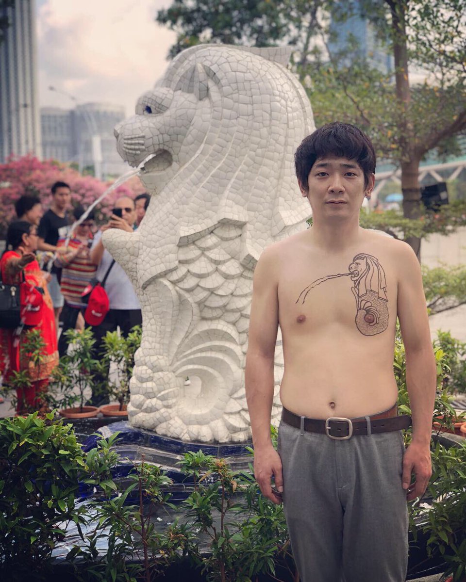 シンガポール。まさかのマーライオンが2年に1回の改修工事中。でっかいマーライオンを後ろに写したかった。小ライオンで我慢。これはこれで。